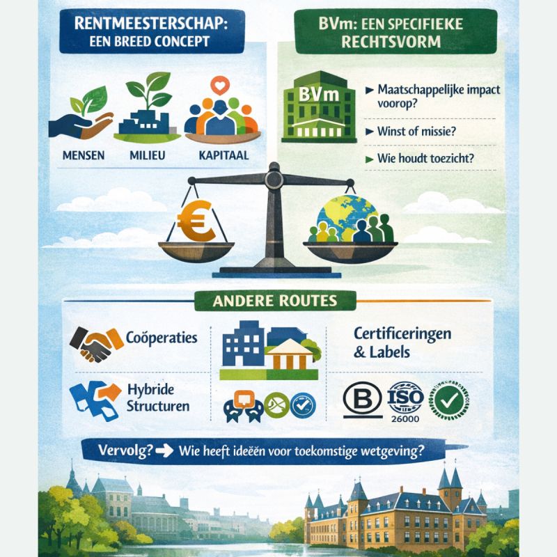 In het coalitieakkoord 2026–2030 van D66, VVD en CDA (blz. 29): “We stimuleren duurzaam en verantwoord ondernemerschap. We nemen de ‘rentmeestervennootschap’ op in de wet als rechtsvorm voor bedrijven. We verlagen administratieve lasten en kosten voor bedrijven die duurzaam willen ondernemen.”